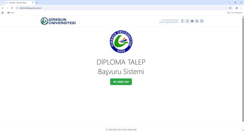 Diploma Talep Sistemimize giriş yaparak sistem üzerinden diplomasını kargo ile adreslerine talep edebileceklerdir. Kargo takip numarası sistemdeki öğrenci arayüzünde görülecektir. Alınan talepler 15-20 iş günü içerisinde kargoya teslim edilecektir.